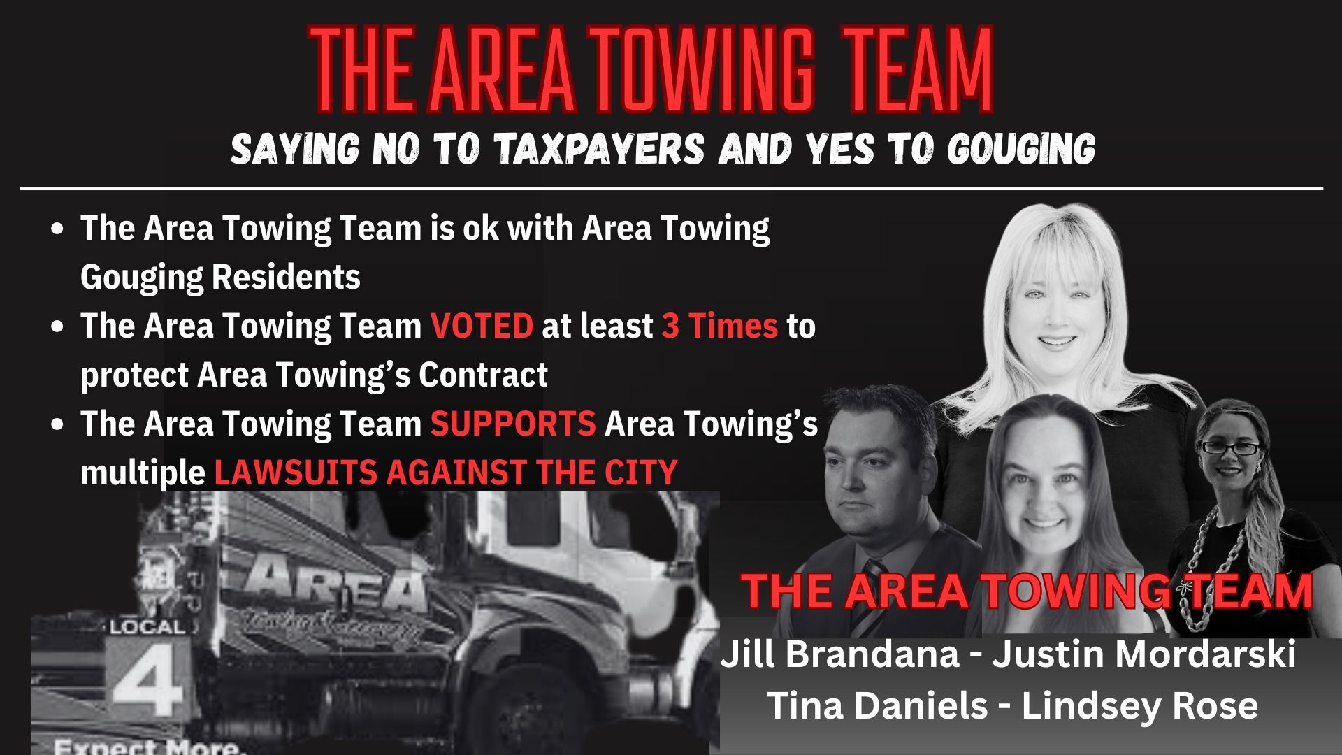 A group of local influencers and political allies has aligned themselves with Area Towing to maintain the company’s grip on city towing operations—despite mounting complaints from residents about price gouging and unethical practices. This team has consistently blocked reform efforts, undermined transparency, and enabled Area Towing to operate without meaningful oversight. Their coordinated resistance has not only stifled competition but allowed inflated rates and questionable impound procedures to become the norm, harming working families and small businesses alike.